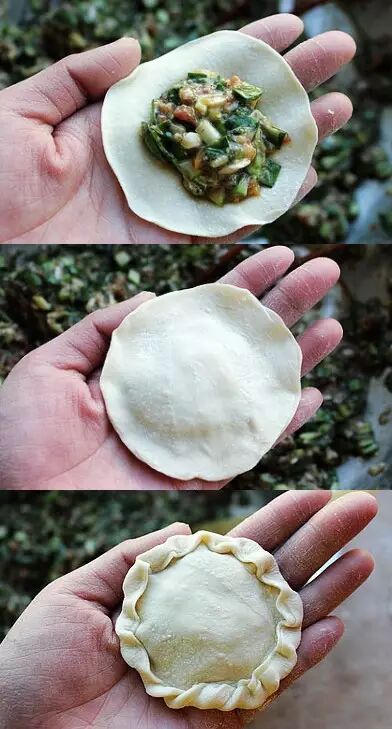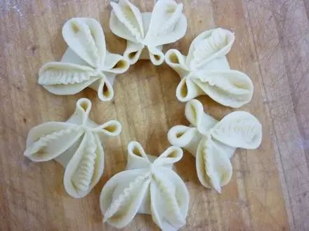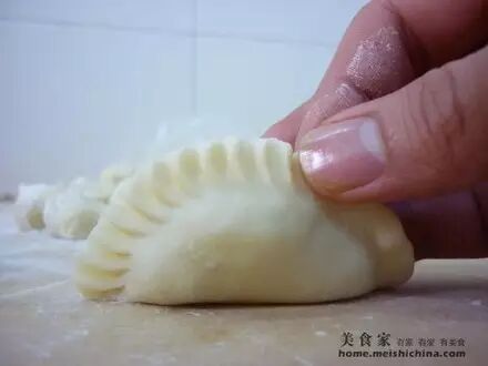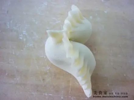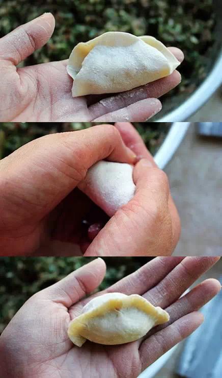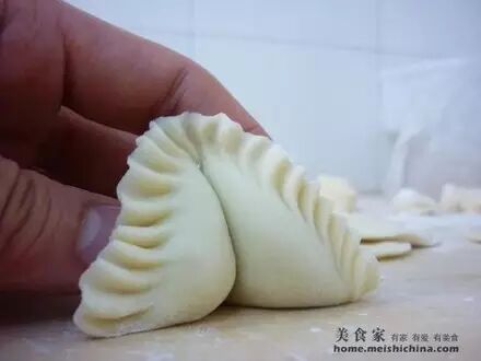 龙口人叫“嘎啦”的东西,这个饺子关键在于两边要藏进去一小截,成为蛤蜊的壳,对折好后,将其捏起来,成型。