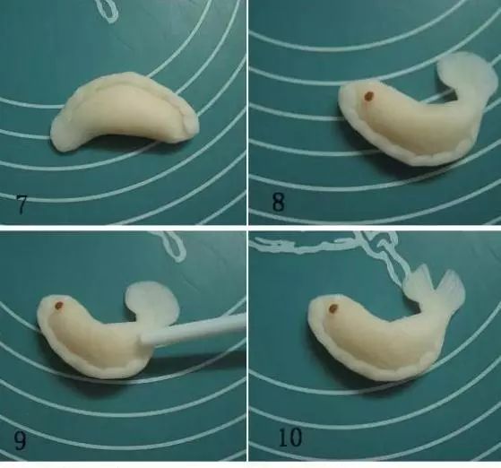 步骤:1、澄面和10克玉米淀粉混合,把刚烧开的烫水倒入,边倒边进行搅拌; 2、搅拌至手温时,加入剩下的玉米淀粉搅拌; 3、倒入色拉油,揉拌至顺滑; 4、放入保鲜袋静默30分钟; 5、取出一小部分,用擀面杖擀成薄片,用模具压出圆片; 6、右角捏进里面,其余象包饺子一样包好; 7、 边上捏出花纹; 8、用加了可可粉的澄面团做成鱼眼,镶于鱼头上; 9、用刮刀刻出鱼头,用吸管刻出鱼鳞;(图9) 10、用剪刀剪出鱼尾;(图10) 11、放入竹屉上,大火蒸3分钟;