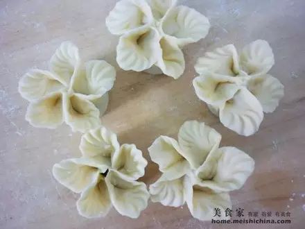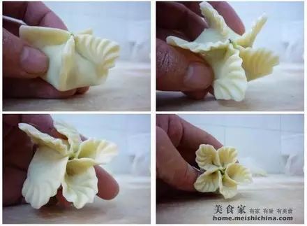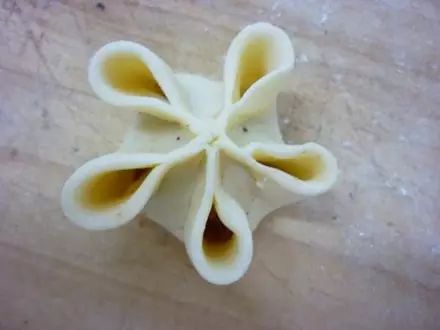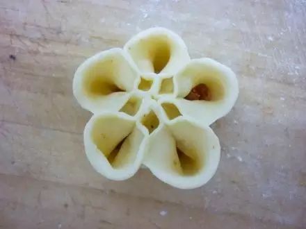 放入馅心均分五点向中心捏在一起,形成如图所示的形状,把相邻的两边再相粘结,在每片花瓣上剪两刀,就形成了牡丹花的花瓣,把熟蛋黄碾碎,放入花瓣中作点缀![]()