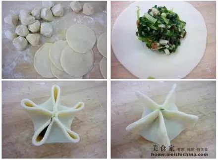 在锅贴的基础上,左右两边再捏合,留出四个小口,这里每相邻两边捏合,捏的时候可以沾点水,把开口弄好。随便往里放四种你喜欢的,就是四喜蒸饺的原型~