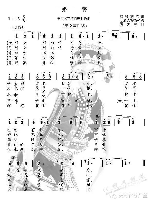 《婚誓》由著名电影音乐作曲家雷振邦创作,为长春电影制片厂1957年摄制的<芦笙恋歌>的插曲。