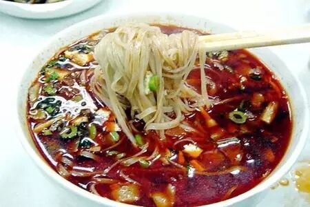 西安凉皮是陕西著名小吃,在西安无论是高级餐厅还是街头小贩都能看到凉皮的身影!西安街上贩卖的凉皮,米皮白且透亮,蒸笼有多大就能蒸出多大一张,蒸好后一张与一张之间略抹熟菜油,然后一层层摞起来,堆在案头如同招牌一般。吃的时候小贩会直接将米皮切成筷子般粗细,然后放上盐、醋、特制的调料水、配上豆芽等小菜,最后用勺子挖一大勺辣椒出来,红红的,油油的,一起淋到皮子上。这样的凉皮咬一口滋滋冒油,那种香辣透心、鲜美爽口的感觉实在过瘾!