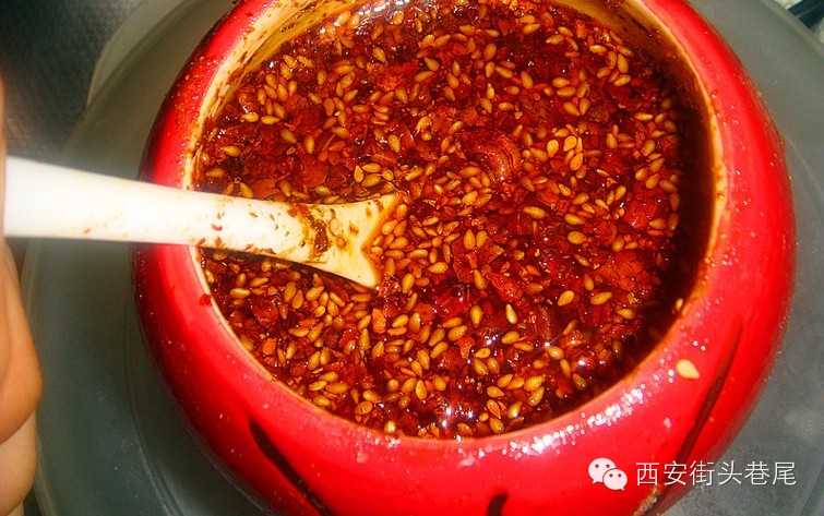 关中人对于辣子情有独钟,爱吃,而且和别的地方吃法不同,不吃干辣子面,而是油泼辣子。秦椒是很有名的,不但辣味十足,且具有独特的香味。油泼辣子做法很简单,也很有意思,同样是一样的辣子面,可家家的味道不同。