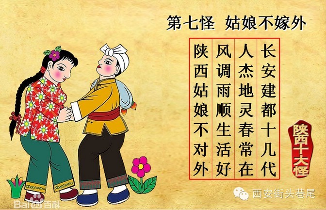 这一怪很多地区都有,只是在关中地区现象更突显,人情味也更浓郁。“两亩地一头牛,老婆孩子热炕头”是关中男人的写照,它的正面意思是关中男人恋家恋婆娘,在“玩龙玩虎不如玩黄土”的小农时代,这种思想也算正统。既然关中男人还不错,那么,这里的姑娘自然爱嫁当地郎了。配合这一观念的还有这里的地理优势,八百里秦川自古都是自给自足的宝地,风调雨顺,物产丰富,缺灾少害。所以,民殷实而安于现状,不思外出谋生。