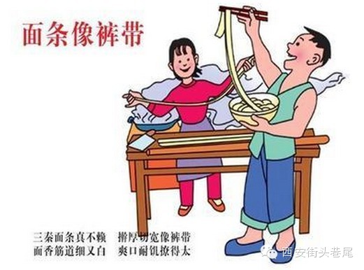 其实,在关中,聪明灵巧的关中婆娘们已经把面食发展到一个很高的境界了。单是一个简单的面条,关中人做出的花样达几十种,棍棍面、片片面、凉面、臊子面、酸汤面、浆水面等等。说其像裤带,说的是面做的宽度和长度,在关中地区的面馆,一碗面只有一根面条,但若要让个弱女子能把这根面条吃完,那也是难事。 其中属棍棍面最长,臊子面最少,一碗饭只够吃一口,因此有得名:一口香。关中的男人娶媳妇,大多都是要看这女人的擀面手艺了。