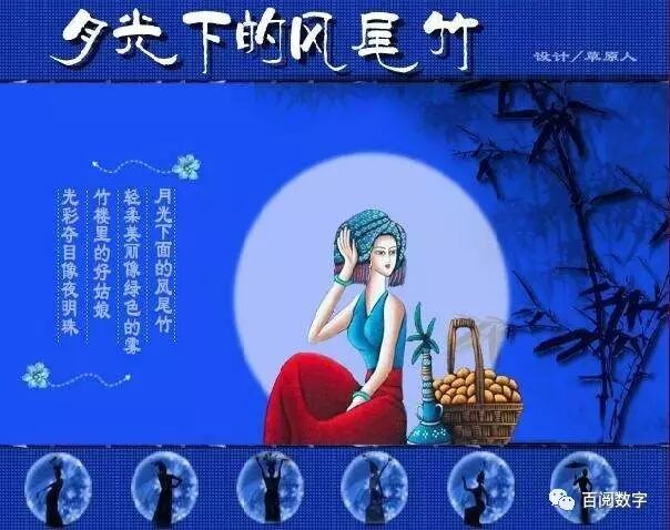月光下的凤尾竹,当乐曲清幽飘起的时候,我把自己带到了澜沧江边翠绿欲滴的凤尾竹林,穿起心仪已久的筒裙,在碧波莹莹的丽江边漫步起舞,等待心上人的到来。