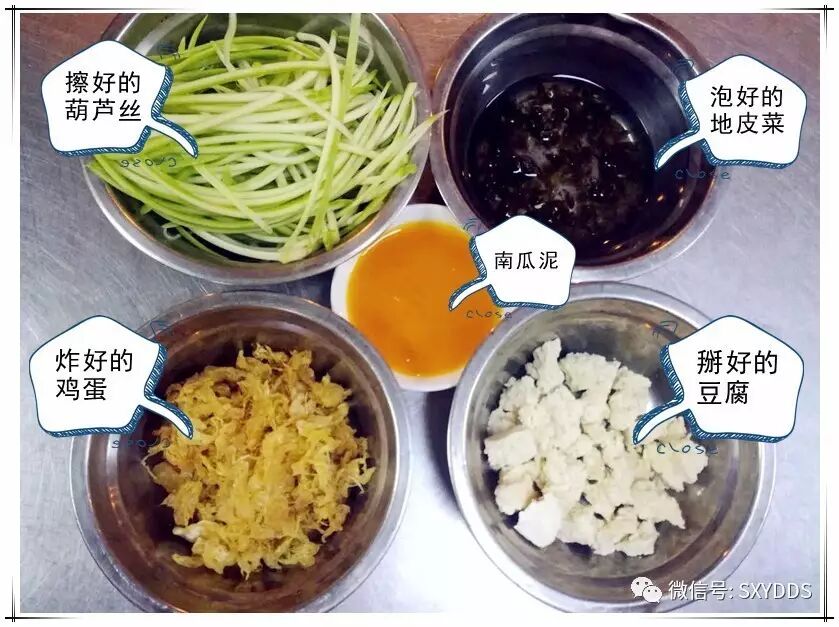 辅料:鸡蛋1颗、豆腐50克、地皮菜20克、南瓜泥少许、摘麻花少许、葱蒜少许、高汤适量(骨汤)