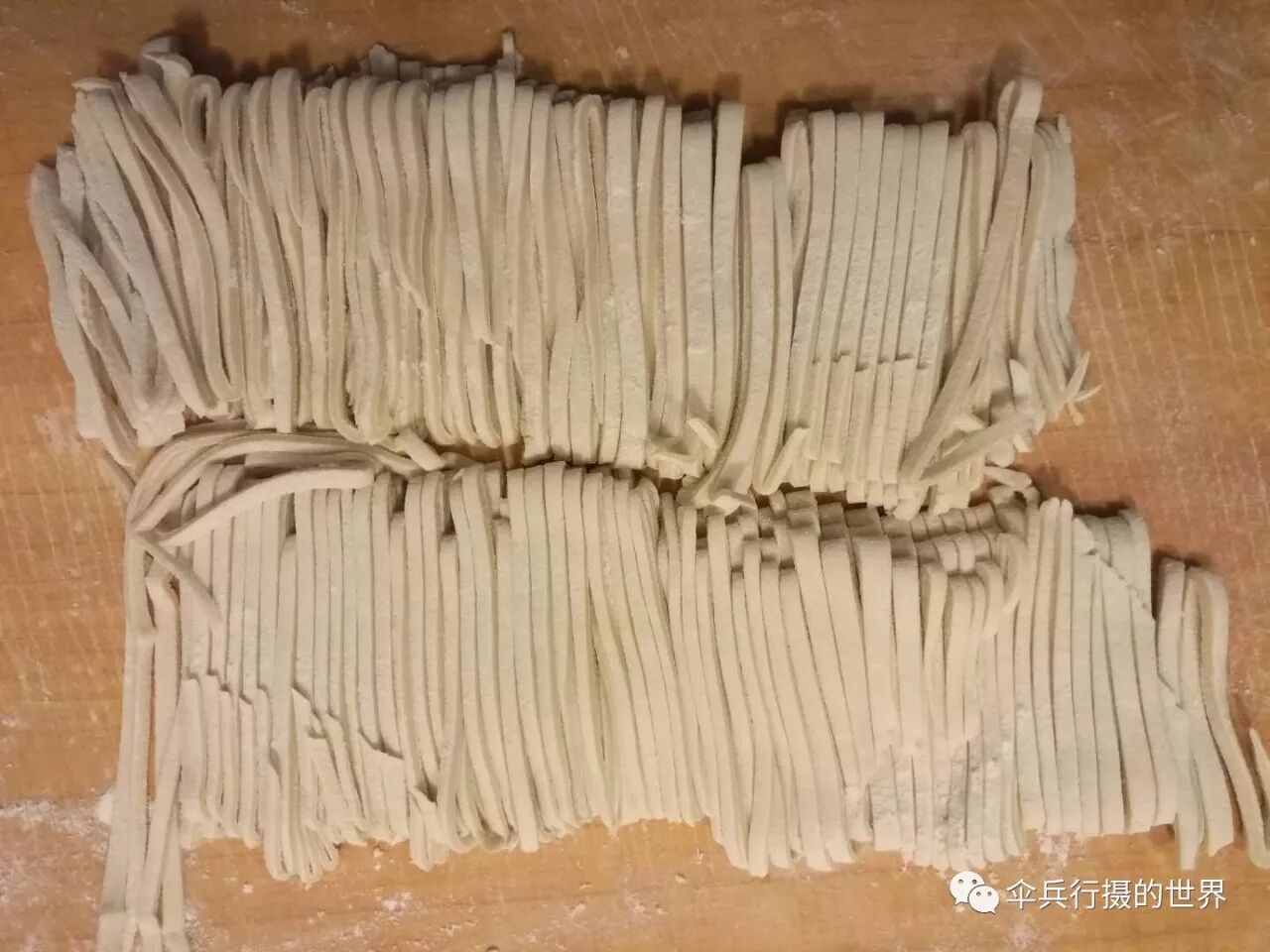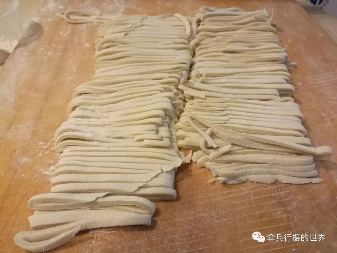 很久没有自己擀面了,我掂量着用多少面,多少水,至少做到三光(面光、手光、盆光,)是没问题的。意思是说和面和的很干净利索,手上盆上都不会粘上面。我想和面和的硬一点,擀出来会比较筋道,也比较好切。三勺子面先试一下吧。很快面和出来了,真是硬,柔面很费了点劲。先醒一会儿面吧,十五分钟。她们娘儿俩还没有回来,我还能干点别的。