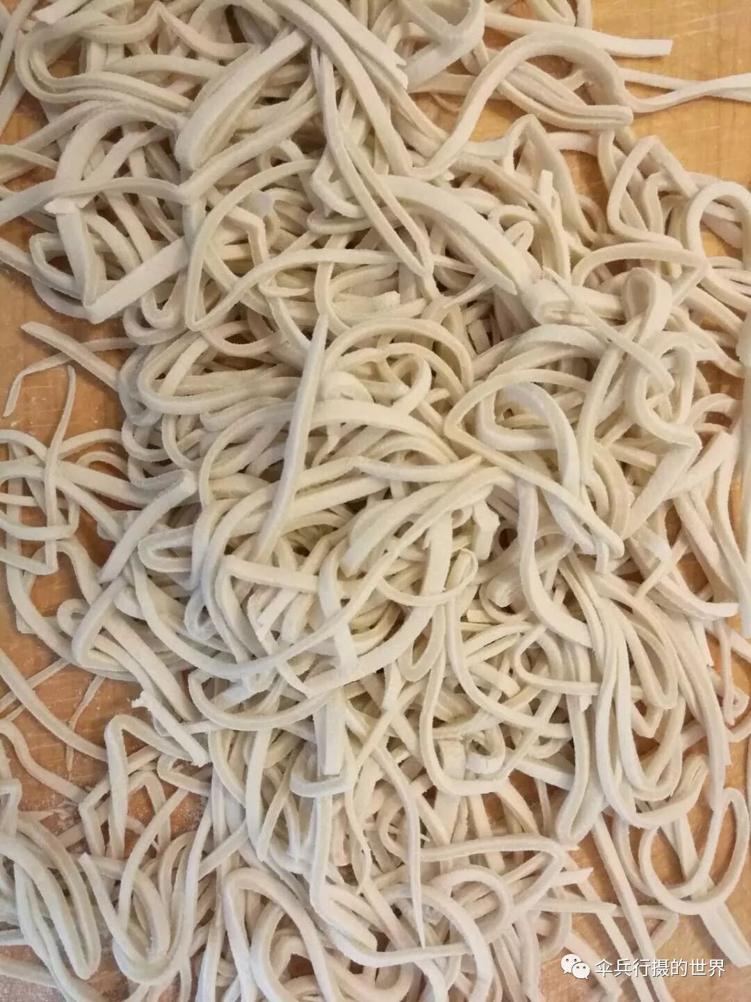 案板50公分见方,有点小,擀面杖我挑了一根最长的,也是50公分。短小的用来擀饺子皮比较好。人都回来了,小朱开始打卤。黄花、木耳、蘑菇是提前泡好的。五花肉也是提前白水煮好的。她那边准备的差不多,我就开始擀面。擀了整整一案板大,很薄,撒上面粉,来回折叠五六层,每层都撒些面粉,为了防止粘在一起。切成细丝,手一拎,长长的面条就好了。