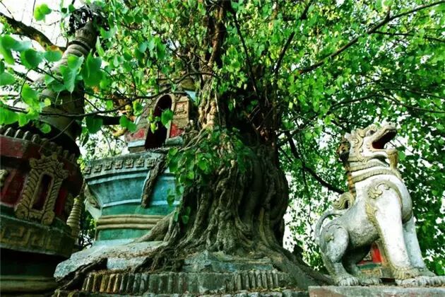 树包塔位于潞西市友谊路,芒市第一小学内,傣语称“广母姐列”,原名铁城佛塔,是为了纪念一次战事而建的,佛塔为实心的砖塔,被树根缠绕覆盖,故名树包塔,是当地傣族建造最早的佛塔。 神奇别致的树包塔,塔身象一尊立地的金刚,威严气派,伟岸的菩提树像一把撑开的巨伞护住塔顶。