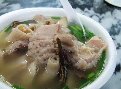 羊杂汤多在立秋后供应(现在一年四季都有供应),用羊肚、羊肺、羊肠、羊心、羊头肉等为原料,吃时碗内放香菜、芝麻酱、辣椒油,汤色奶白,香辣味浓。