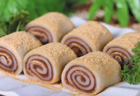 糖卷果主料用山药和大枣,配以青梅、桃仁、瓜仁等辅料。将炸得的卷果倒人,裹上糖汁,撒上白芝麻和白糖,软绵香甜,十分可口。