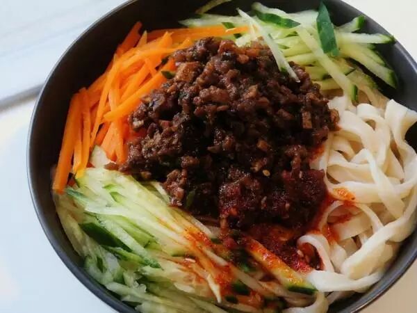 老北京炸酱面菜码有豆芽、芹菜、青豆儿、黄瓜丝、心里美萝卜丝、白菜丝、青蒜、大蒜8样,吃起来甭提多么爽了。