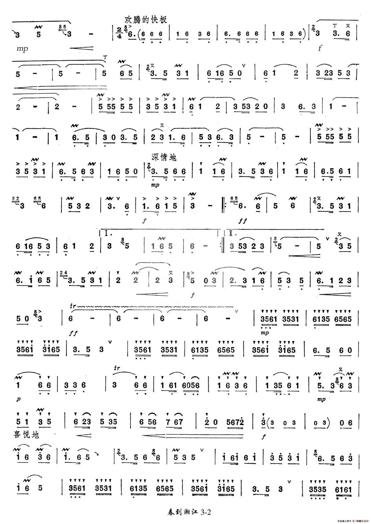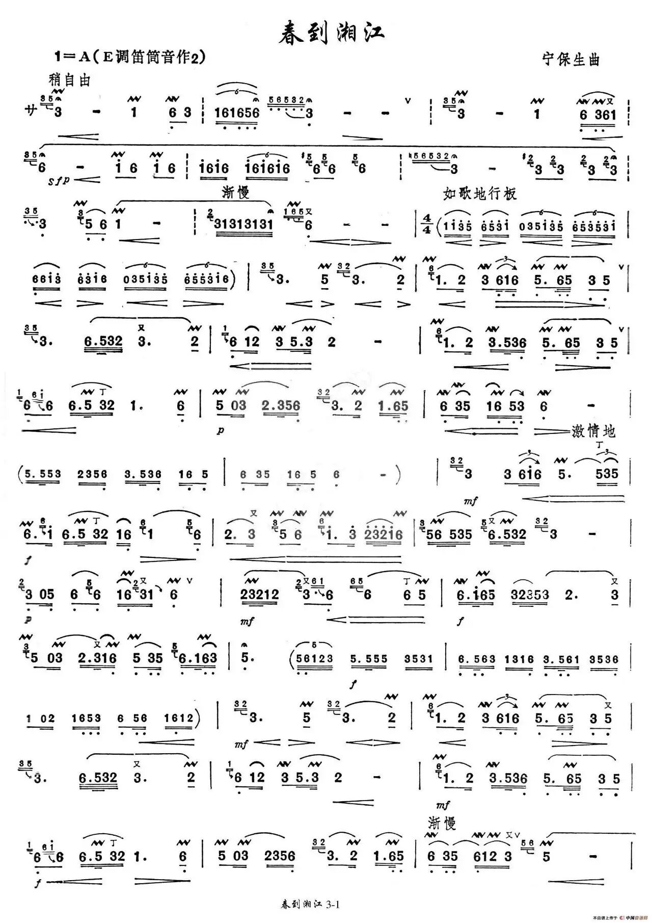 引子是一段散板。它着重表现了湘江的春天来临时的激荡之情,广阔而起伏,内涵而激情,展现了一幅碧波滚滚、烟雾迷蒙的湘江美景:作者对引子的写作与推敲可谓字斟句酌、用心独到,因此,要求演奏者尽可能扎扎实实地体现好每一个音符。整个引子在演奏时要求大气而连贯,体现出一种跌宕之美。第四小节第一拍6的延长音,应尽可能地拉长,并注意音量的变化:从特强后突弱再渐强,以表现一种湘江的壮阔之情,第三、四拍高音1的波音,要吹得生动而富有朝气,以体现湘江的浪花之美。第四、五小节连续的16小三度音型切忌吹成草原风格。另外,#5和b3(即#2)是湖南花鼓音乐的特色音律,在引子和尾声中多次出现,再配以灵活的颤音技巧,湘江之春的波滚和浪花的起伏就鲜活地体现了出来。滑音在全曲中的多处运用,特别是在引子和行板中的运用,使全曲在激情之中更增添了柔美的特色。在演奏引子时,要注意强弱的变化,及与颤音、滑音的配合运用。总之,引子是全曲的开篇,其鲜明的风格和独特的个性都在引子中强烈地体现了出来,引子弹得好坏与否,对全曲的成功起着重要的作用。