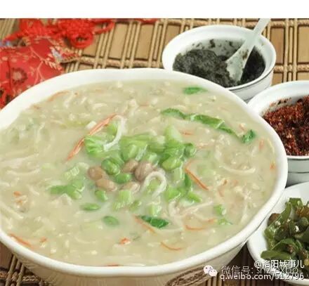 浆面条,既经济、又可口,是河南人普遍喜食的一种风味小吃。它是将豆浆置于适当的温度下,发酵变酸,然后放入锅内加热到80度左右,液面便有一种蘑菇状的浆沫。这时加入少许的香油,反复搅拌,待滚沸,将面条下入,最好是杂面条。拌面糊使之呈糊状。然后,将调制好的盐、葱花、青豆、芹菜、韭菜、辣椒加入。洛阳浆面条,制作简单,成本低、味道美、易于消化,是具有浓厚地方特色的地方名食。