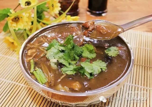 胡辣汤是河南别具风味的小吃,已有百年历史。精烹细作、味道鲜美、经济实惠、方便群众、闻名城乡。始于老城,现遍及大街小巷。主料有精粉面、粉条、肥猪肉。配料有花生仁、芋头、山药、金针、木耳、葱花、蒜片、面筋泡。