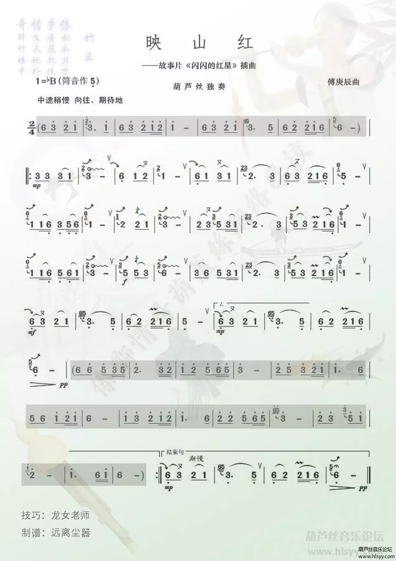 本周我们学习新的葫芦丝初级乐曲《映山红》。这首曲子,对于初学者来说,还是有一定难度的。练习过程中,我们要把葫芦丝技巧融汇到乐曲里,在融合的过程中,手指动作会有些不协调,吹出来的声音也断断续续,不连贯。这些问题,如果有老师现场指导最好,我们可以快速的找准问题,“对症下药”解决问题,进步快。如果没有老师指导,就得学会用耳朵多听示范,多对比,多模仿。