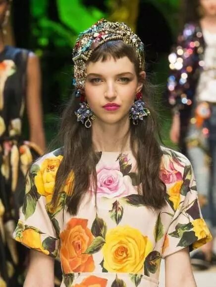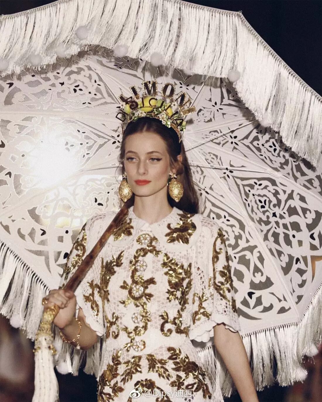 每年Dolce&Gabbana大秀中,头饰都是重中之重,繁复、夸张、华丽的层层堆砌塑造成的模特不再是单纯地走秀工具而成了一个个庄肃的王公贵族。假使去掉了这些头饰,整体造型也就soso了。