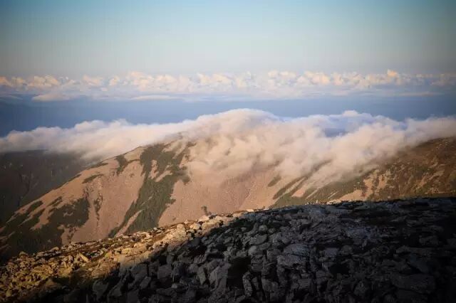 登上顶峰,太白山的美景,尽收眼底,举目眺望,天山相连,那湛蓝的天空和那丝丝掠过的浮云,仿佛是玉女俯览人间的云袖。