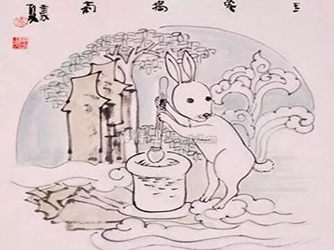 拴着小兔捣碓臼。