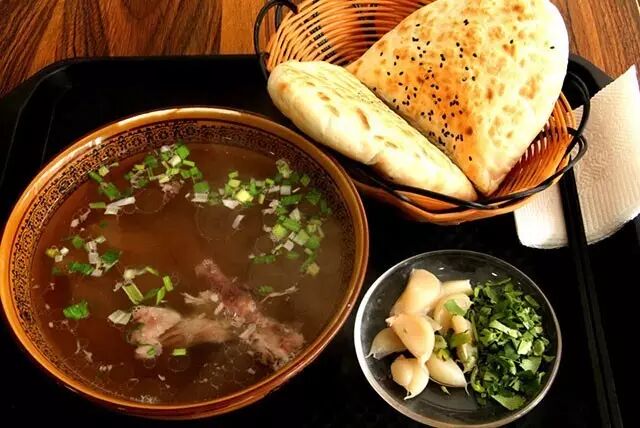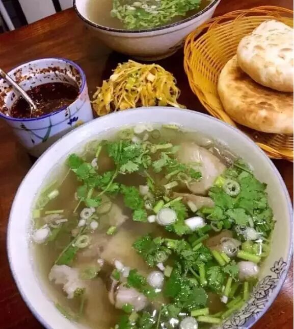 在陕西吃牛羊肉泡馍是很讲究的事情。首先,馍一定是自己掰的而非机器切的。一定要把馍掰称黄豆大小。然后招呼伙计。