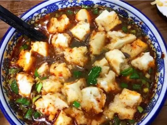 透过油层,碧玉般的豆腐块、黄金般的粉条、银白色的葱节、火黄色的蒜沫若隐若现,切成块的锅盔馍埋在下边,手一端碗,香气扑鼻。