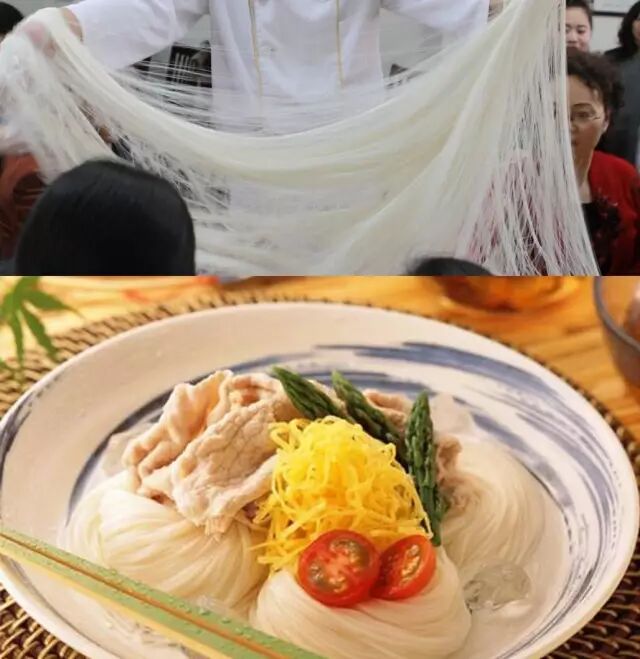 师傅往往会将面的一端聚过头顶,不停抖动,如瀑布般“飞流直下三千尺,疑是银河落九天”的呈现在食客面前。