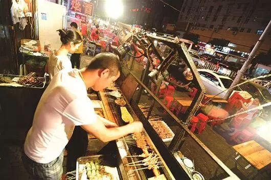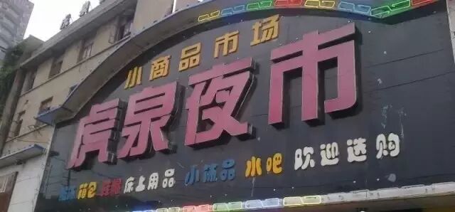 先是做周边学生生意在城中村形成的一个小市场,环境大多比较简陋,露天搭的简易棚子。后来在路口做了个门楼,直接打起了“虎泉夜市”的招牌。这时的夜晚就异常热闹了,主要来光顾的已经不仅是学生,还有广大的宵夜爱好者了。
