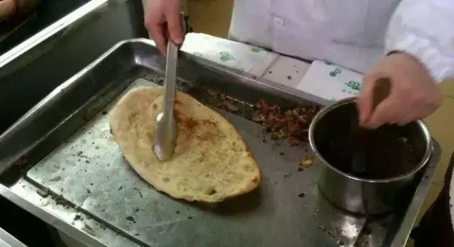 矮子锅盔几分钟一个,做的速度非常快。从炉子里夹出来后,师傅会问你吃不吃辣,吃的话就会给你刷上一道辣油,再对折装进袋子递给你,并会叮嘱你这个要趁热才好吃。
