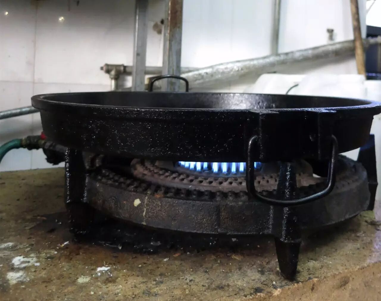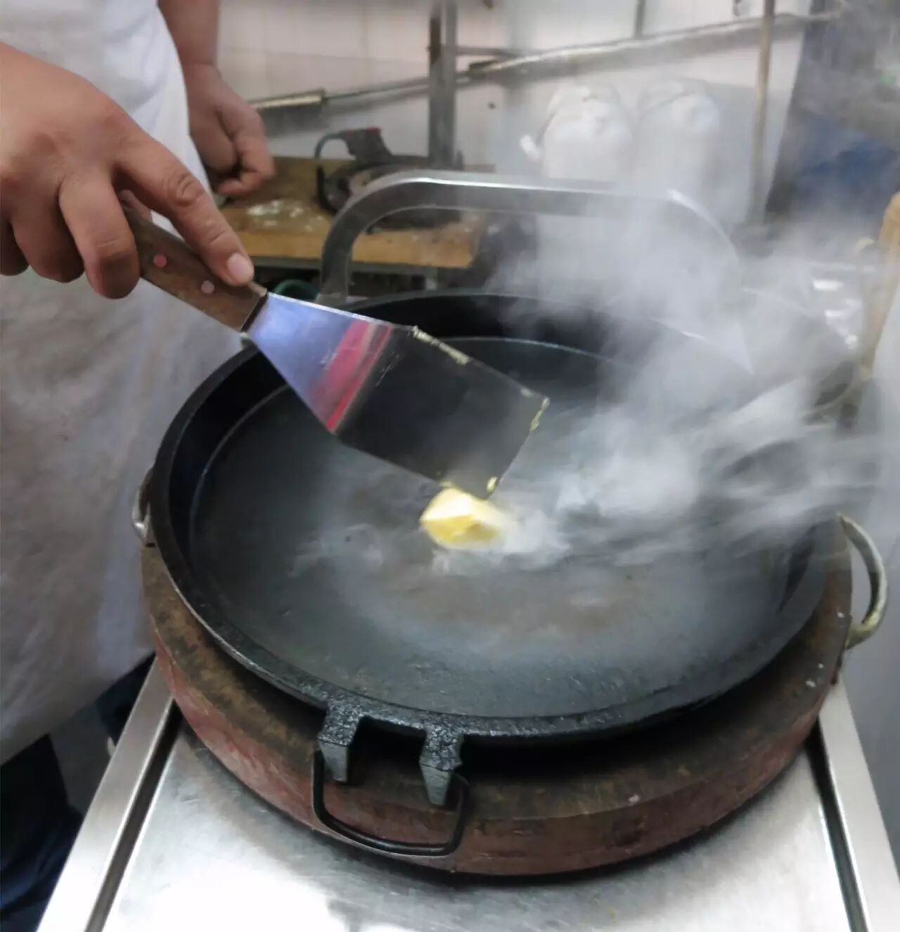 烧热的铁板放入摆有隔热木板的推车上,放黄油烧化。