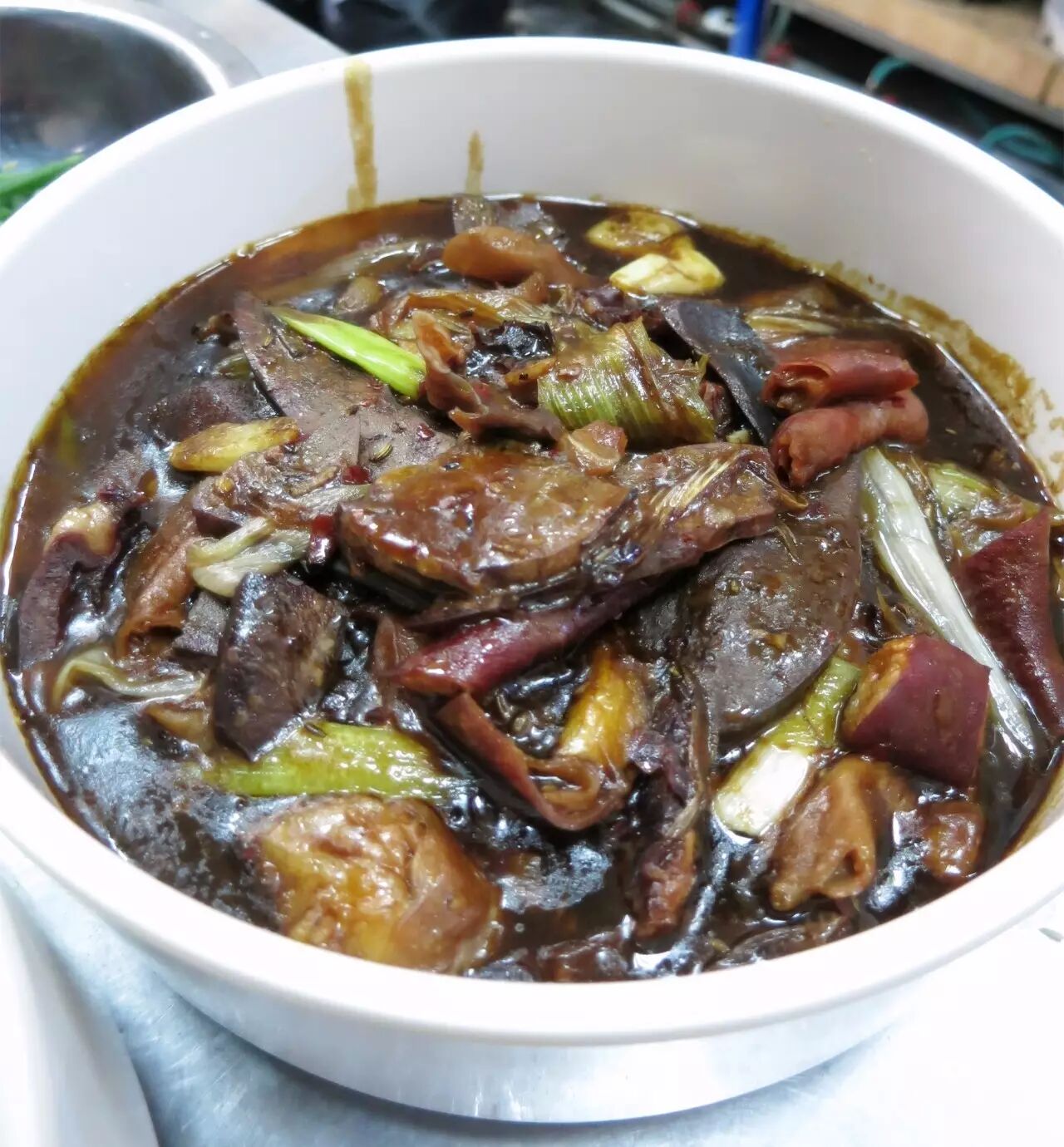再倒入羊杂,表面撒香葱段、泡灯笼椒。