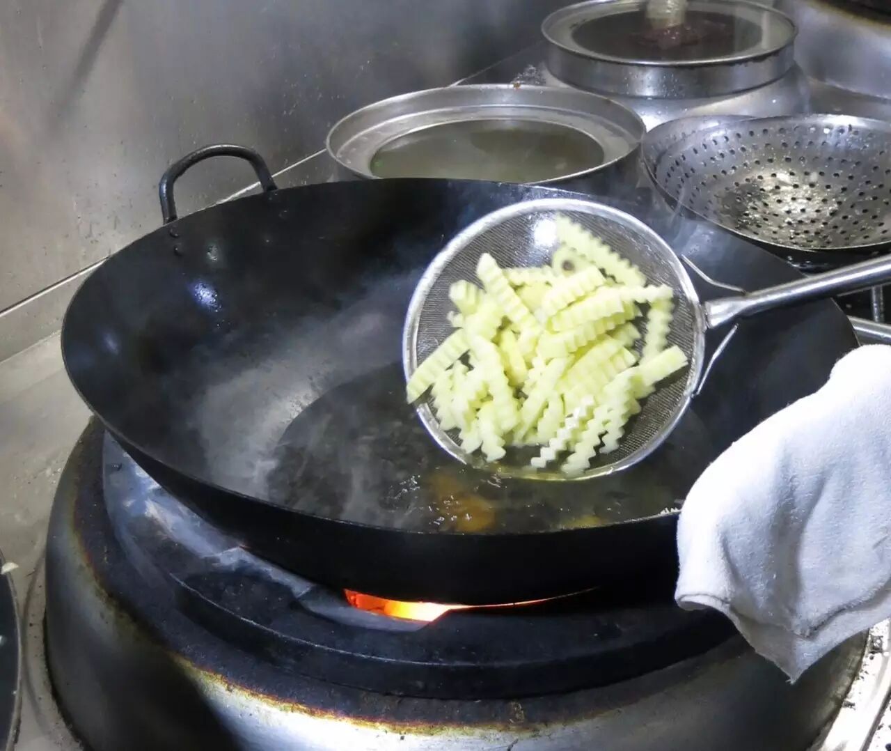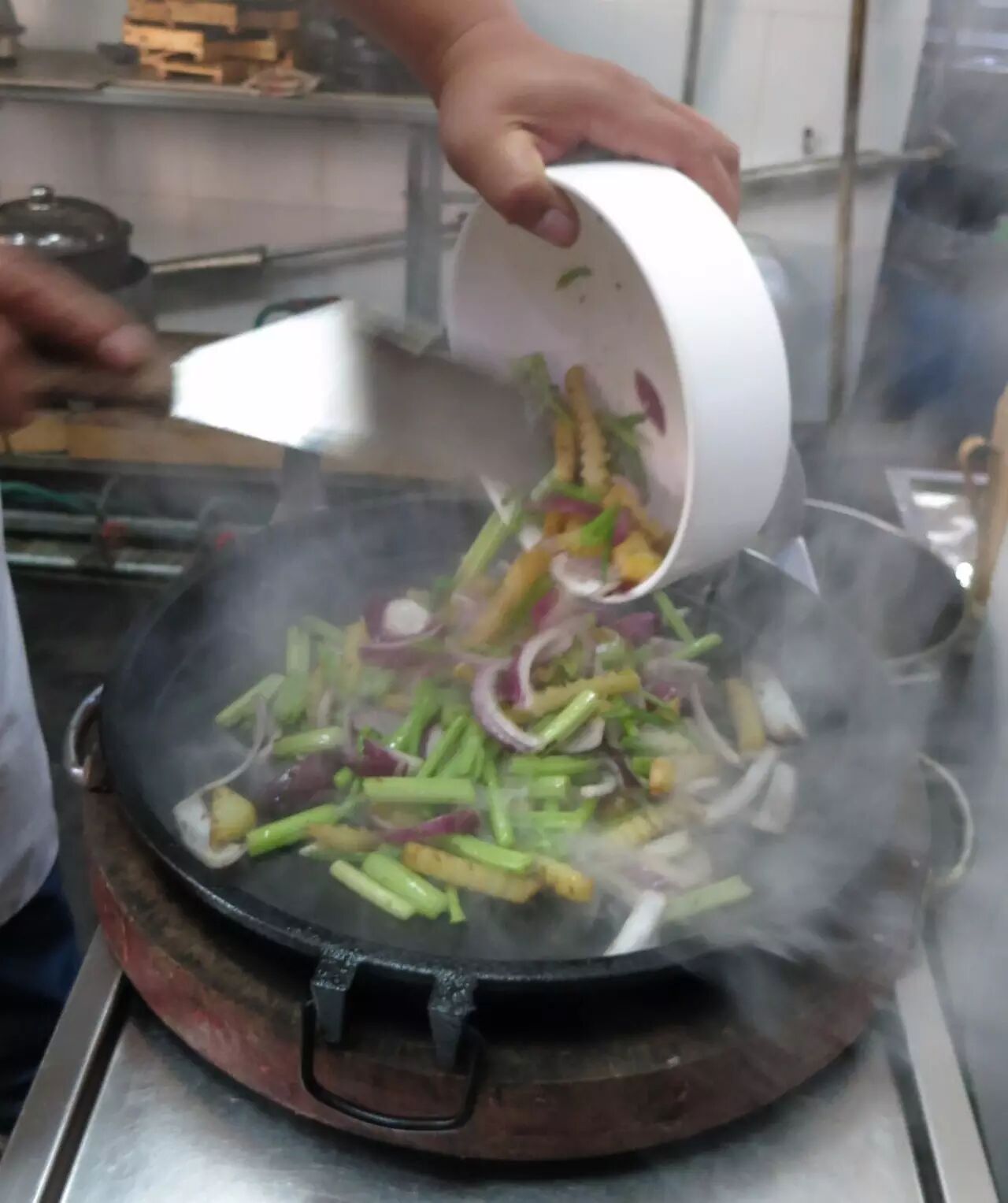 拉过油的蔬菜条入锅,加孜然粒、盐等调料大火爆炒。
