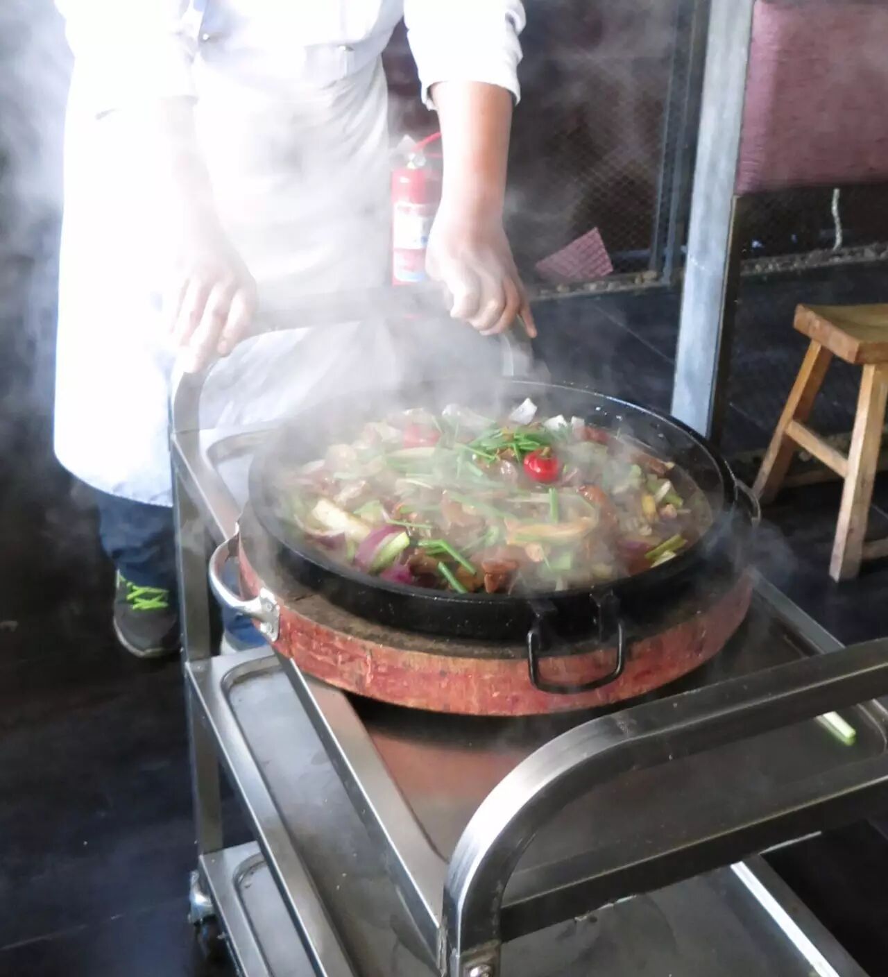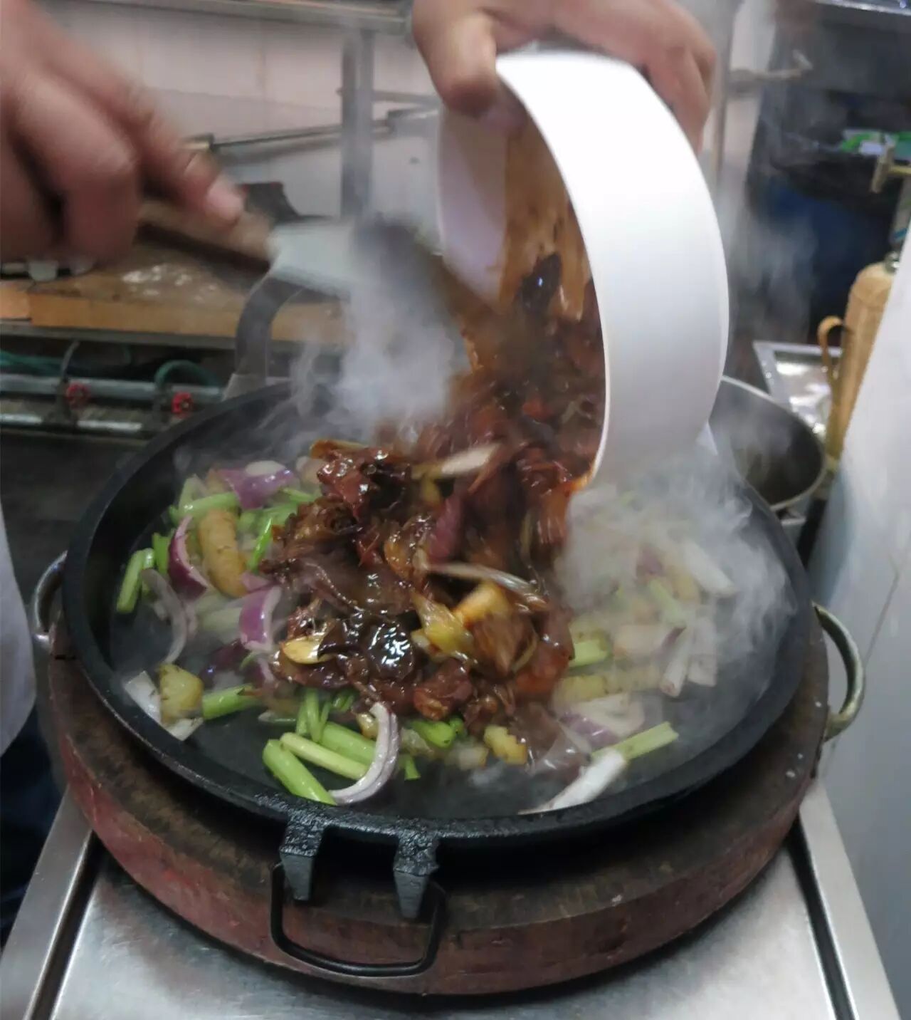 这道全羊优品汇选用羊的肠、肚、脸、心、肝、肺六种原料,先清水高压,再加酱爆炒,最后与辅料一同放入直径约50厘米的热铁板上,当原料与铁板接触的瞬间香气霎时逸出,并在服务员从厨房推至餐桌上的一路不断散发,可谓“一人买单,多人闻香”。
