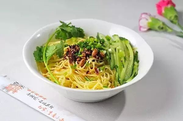 牛肉面不像普通的兰州牛肉拉面,牛肉是小方块的颗粒,凉面也是拉面,吃起来很是劲道,拌以黄瓜丝,芝麻酱及牛肉粒,再浇上油泼辣子搅匀,大口吃进嘴里才是过瘾!