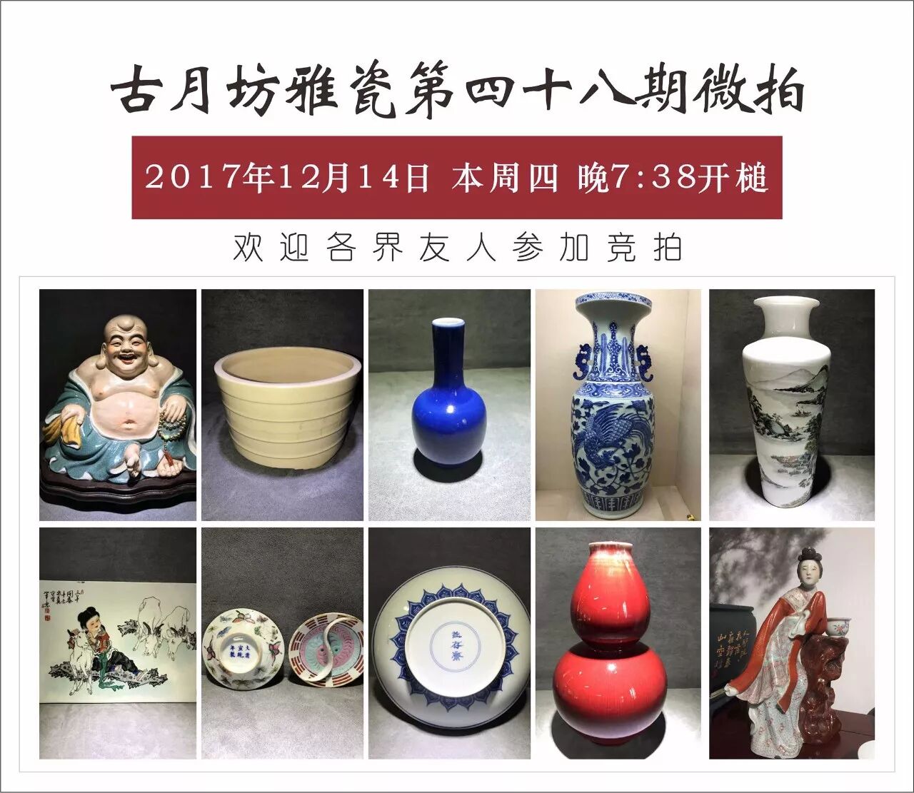 从【古月坊雅瓷】第十一期微拍开始,拍卖时间将改为每周星期四 晚上7:38分开槌。拍卖期间,为了保持好的拍卖环境,请听从拍卖师主持和安排,各群友请勿在拍卖当天及拍卖进行期间发出与拍卖无关的图片、文字、广告链接。拍卖师发出拍品照片及文字说明,并宣布“开始竞拍”,此后群友的竞价方为有效竞价。