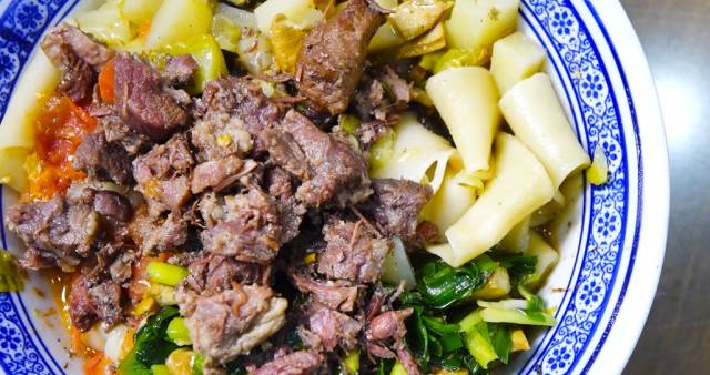 biangbiang面是它是关中的传统风味面食,一寸多宽的面条,在扯面师傅的手里欢快起舞,biangbiang的击打着面案,再截成一段段的投入滚开的大锅中,两沸即成。