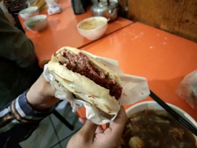 晚上回来已经饿坏了,西安的朋友,又来带我们去品尝西安美食:猪肉肉夹馍、岐山哨子面、凉皮子。果然西安吃的肉夹馍,和其他地方吃的差异性很大,肉更加好,而且份量多,虽然有点小油。当然西安的冰峰也少不了,有点类似北京的北冰洋,搭配油腻食物,西安的酸梅汤也是不错的选择。