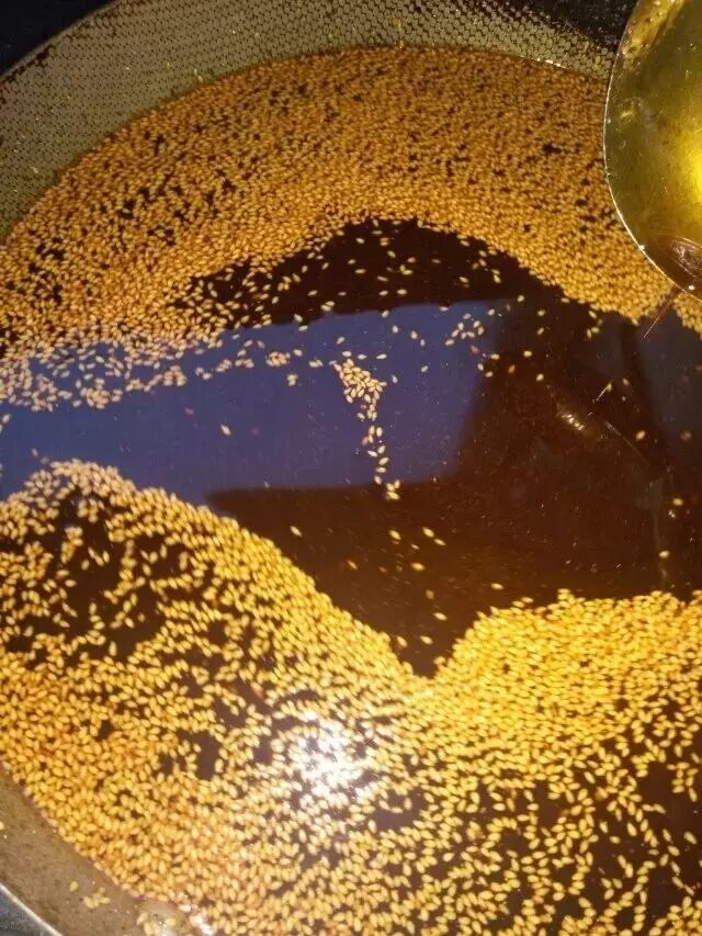 搅,防止芝麻变黑。(此时芝麻会有沸锅的状态,不会有噼里啪啦的爆裂声)