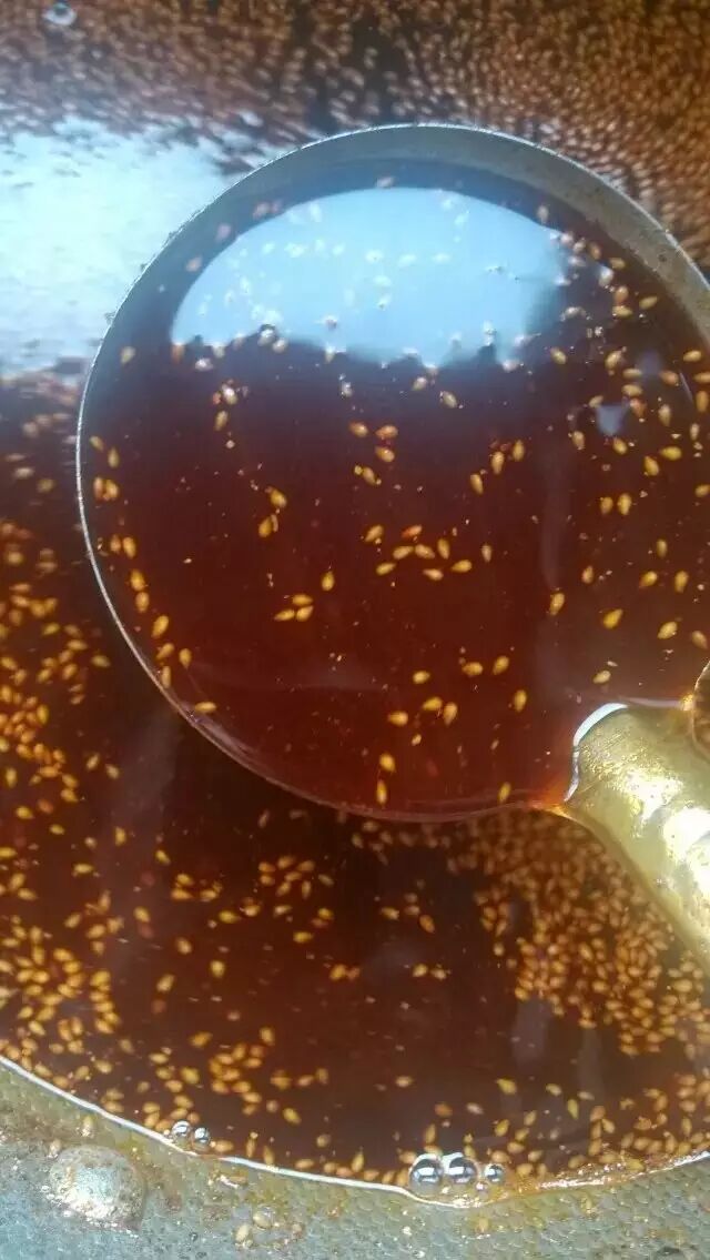 配比 500克菜籽油、25克祖传秘制香料、50克辣椒面、脱皮白芝麻15克、葱姜蒜适量