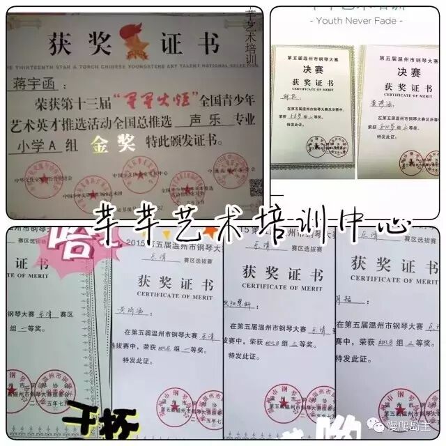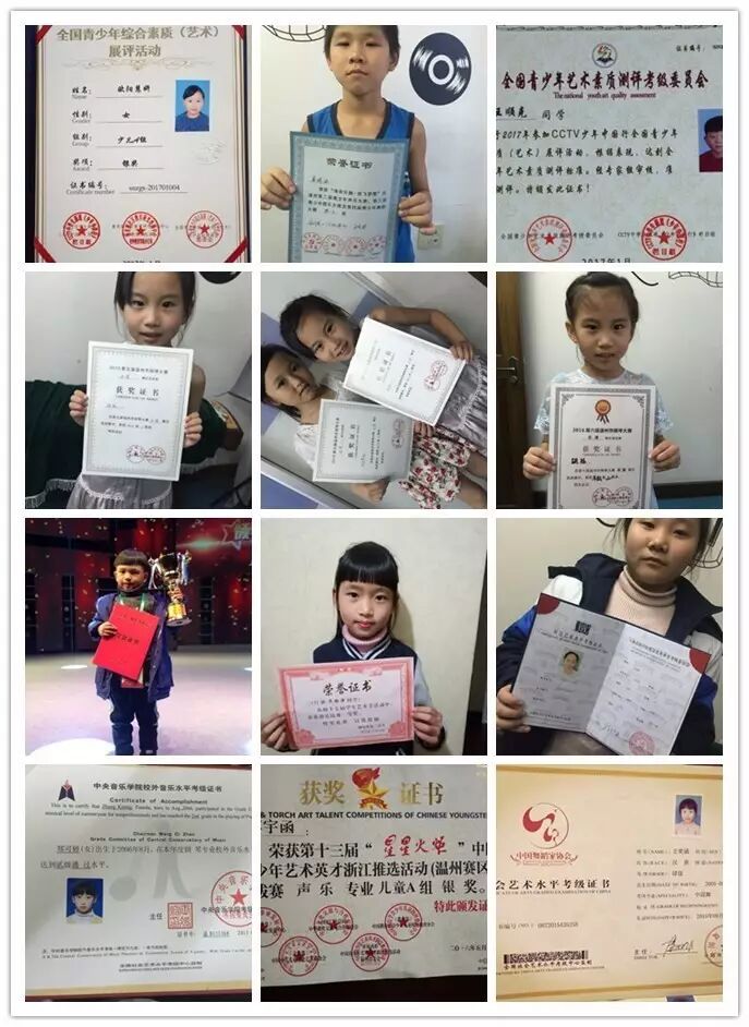 “十三届星星火炬杯”中国青少年英才浙江比赛荣获金奖,银奖.;”清音乐舞,放飞梦想“乐清第二届青少年声乐大赛,第三届青少年器乐大赛荣获铜奖;温州第五届钢琴大赛二,三等奖;柳市二小艺术节荣获一等奖;柳市一小艺术节荣获一等奖;育英艺术节荣获百灵鸟奖;全国春晚荣获金奖及特等奖;全国钢琴大赛二等奖;新丝路新童歌荣获银奖;金奖,银奖:金奖,银奖,铜奖:全国青少年艺术英才推选活动双排键荣获特金奖:”清音乐舞,放飞梦想“乐清第三届青少年声乐大赛,第四届青少年器乐大赛荣获金奖,银奖,铜奖;浙江首届葫芦丝巴乌全国邀请赛荣获金奖:中国肖邦青少年钢琴浙江赛区荣获金奖:第八届少年儿童艺术系列活动“小演奏家“荣获金奖:全国艺术特长生展示大合浙江赛区荣获金奖.............