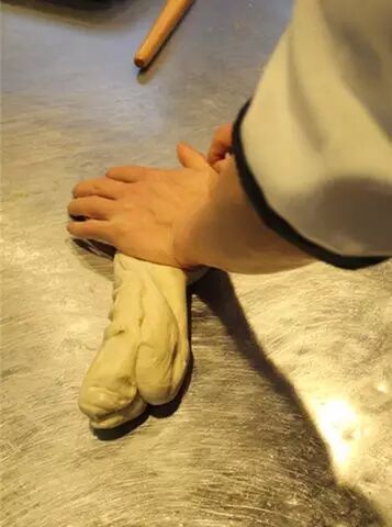 2、案板上抹一层菜籽油,取新面、老面(老面是前一次发酵时留下的面,含有大量乳酸,可帮助新面快速发酵)和盐反复揉搋,重复抹油、搋按的过程2-3遍,保证面团充分吸入油的香气。