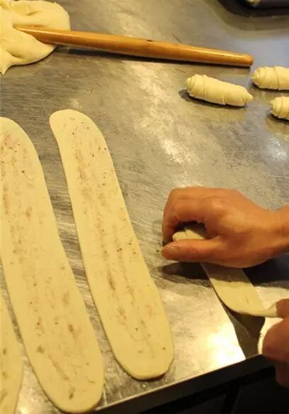 3、将面团揪成剂子,在表面抹少量菜籽油,用擀面杖擀成长条状。手指抻着面片的下端,将擀面杖置于其下的中间位置用力向前一甩,薄厚均匀、长约25厘米的面片就服服帖帖地躺在案板上了。