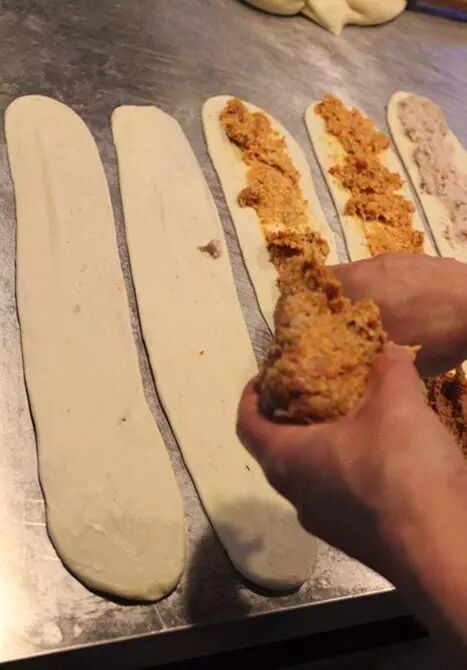 6、抹上牛肉馅或猪肉馅,重复上述过程卷成“墩子”,抹上菜籽油、撒上芝麻,压扁并擀成锅魁生坯。