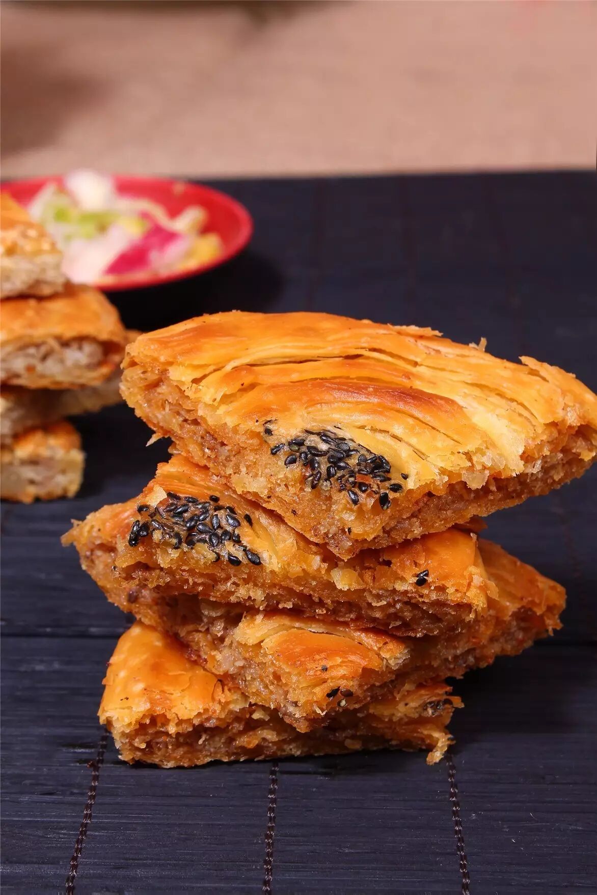 制作锅魁的师傅是地道的彭州市军屯镇人,有二十余年的经验,他为小微揭示了产生独特香气的三点秘诀:首先,揉面、擀制、下剂等多个流程中需要加入生菜籽油,其作用是起酥、增香、不粘手;其次,这种锅魁的特殊香味主要来自于拌入猪板油中的一味调料——黑桃籽,是以四川特有水果黑桃的核磨成的粉末;第三,用清水和面时需要加入老面发酵,新老两种面团的比例约为10∶1。有这三点秘诀在手,制成的锅魁就会层次分明、金黄酥脆!