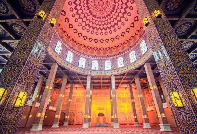走进金顶清真寺的礼仪大殿。目之所及便是高大的礼仪殿,从方柱、墙壁到天花板穹项全是用金边蓝色花纹马赛克镶嵌贴面,用富丽堂皇形容绝不为过!