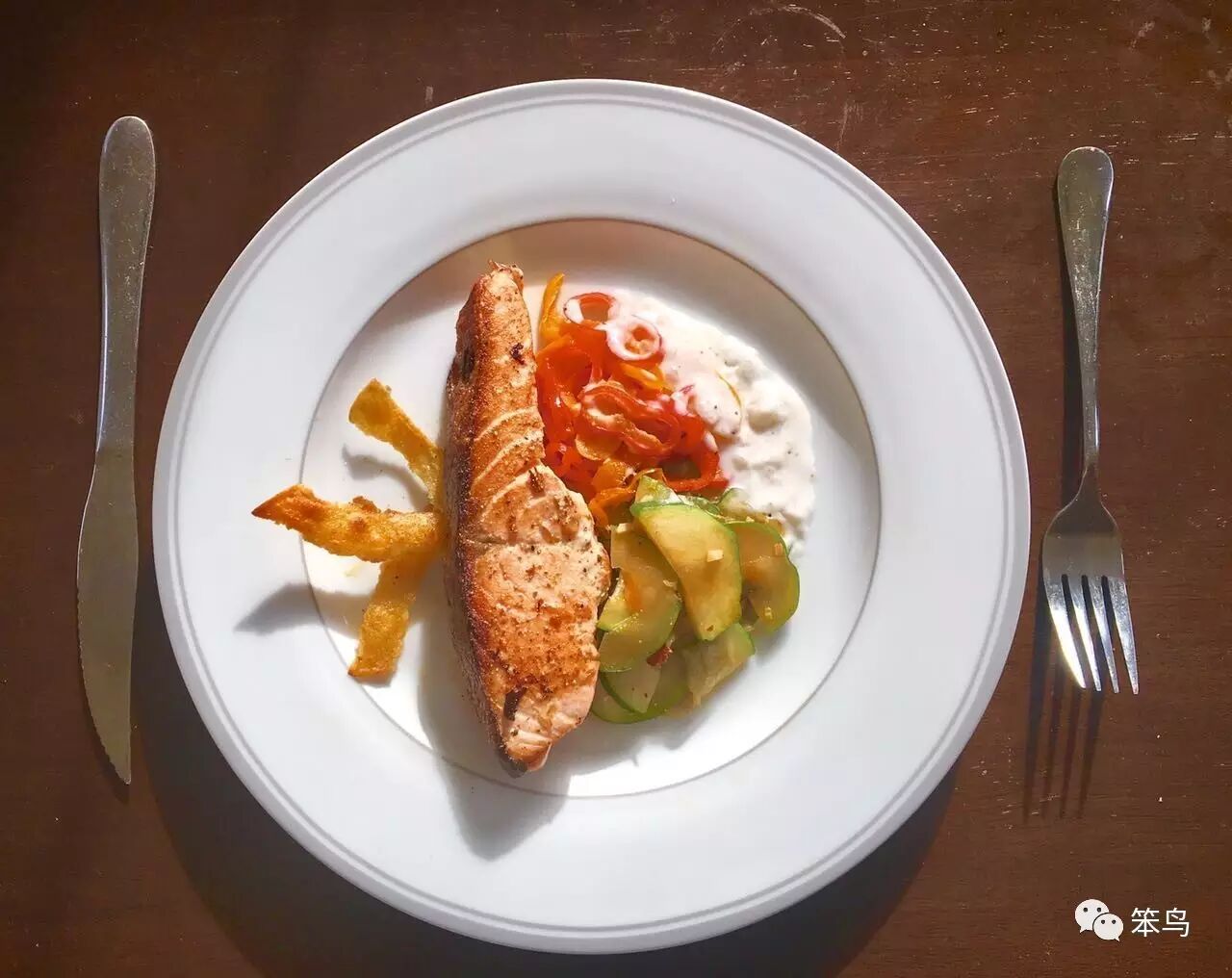 菜名:三文鱼配西葫芦、椰汁小彩椒和烤玉米片