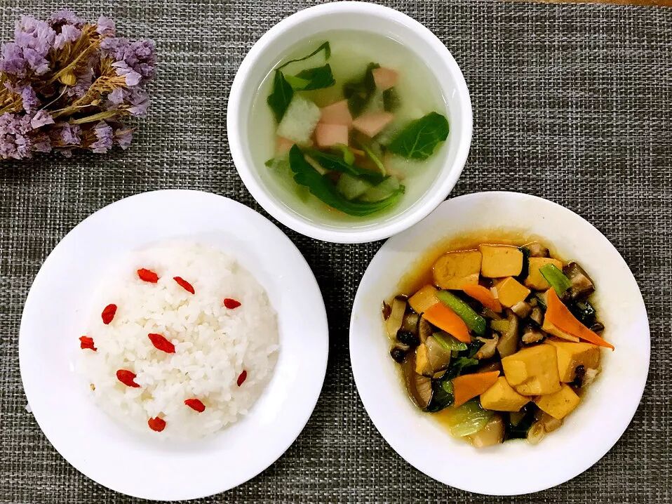 红萝卜、西蓝花属于蔬菜类,豆腐属于豆鱼肉蛋类,建议与米食、红薯、南瓜等全榖根茎类搭配食用,让宝宝能均衡摄取各类营养喔!