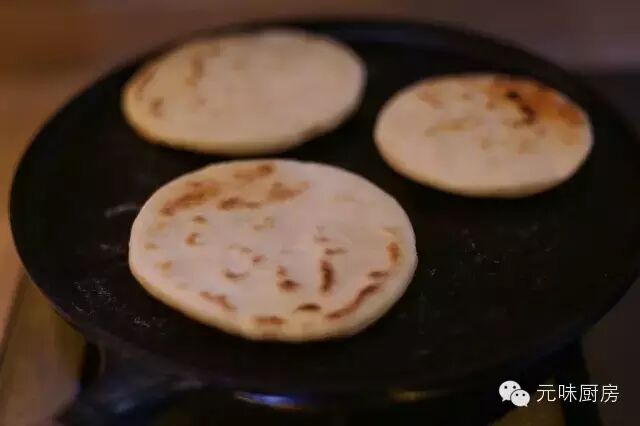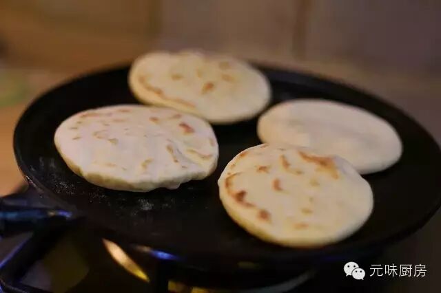 11. 烤饼我用的是平底铸铁锅,这个只要用比较厚底的平底锅都可以,我看北方朋友家就用高压锅烙饼。锅烧热后关火稍凉凉,再开中小火,这个火候要多试两次就有经验了,就是锅温高了饼一上去就会糊,锅温低了会粘锅。锅底什么都不放,饼上去,不会沾的,这样才是烤而不是煎的效果,烤到一面如图色,就翻面。