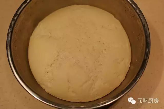 2. 早晨起来先把面团拿出室温放置回温,等面团发酵到二点五到三倍大小,这时的面团是这样滴。