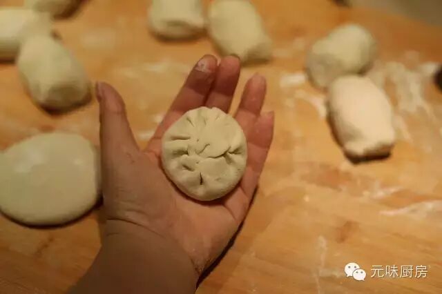 7. 压扁的圆面团翻过来,像包一个空心包子一样把边捏拢。